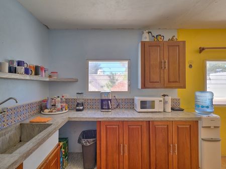 * Kitchen with custom wood cabinets and stained polished concrete tops