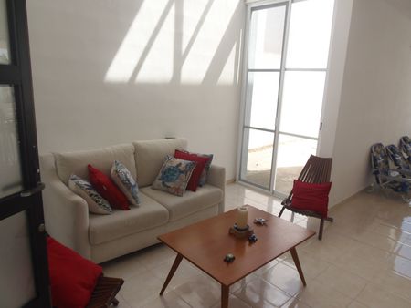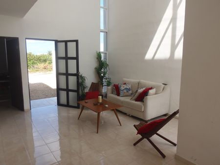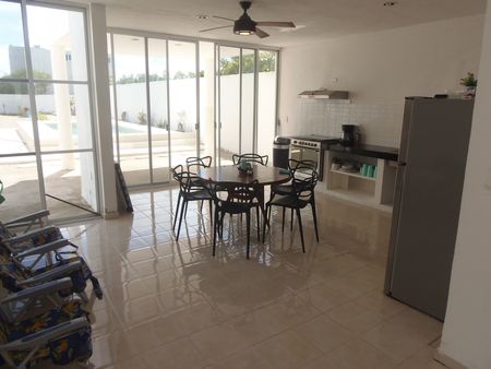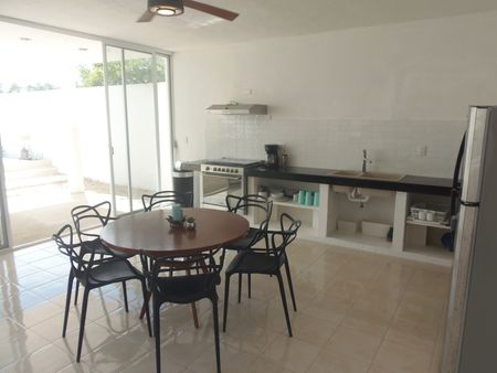 This modern home is a one-minute walk to beautiful sandy beach and is in a very relaxing neighborhood for peace and quiet. This home offers a open floor plan, very high ceilings with lots of natural light flowing thru. Home has a eat in kitchen, large chukum finished pool, 3 bedrooms with 1 bedroom downstairs all with air conditioning, and 2 bathrooms. Just a short drive to Progreso for all shopping needs, banking, hospital, and the famous Malecon.