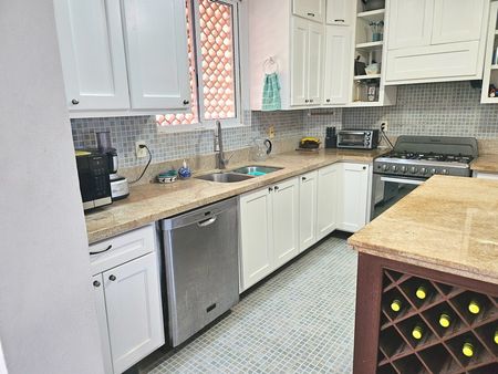 • Modern kitchen with granite countertops, island, and premium cabinetry; includes refrigerator, oven, and dishwasher