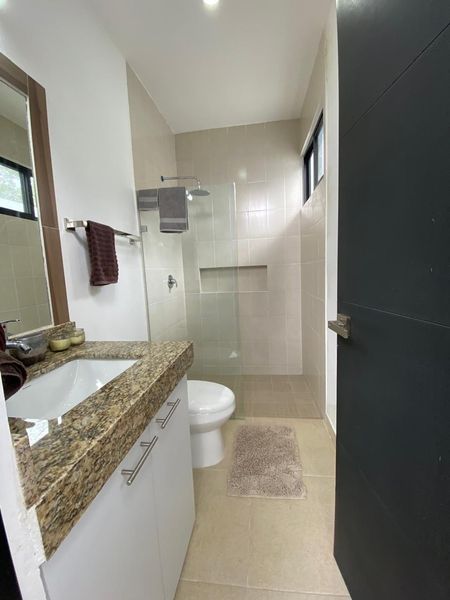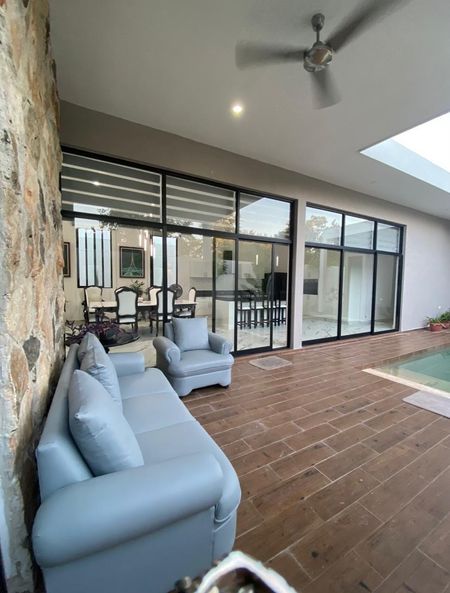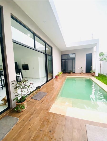 Magnificent home located in private gated community in the northside of Merida. Close to the country club, close to shopping, stores and restaurants. Features a garage, service room with bathroom. There is an open concept with living room, kitchen and dining room. There are three bedrooms, each with its own bathroom and closet space. Nice, covered terrace facing the pool. There is an outside bathroom for the pool and garden area. The house is 12.20-meter front by 35.80 meters deep. The lot is 416.09 square meters. Total construction 287.35 square meters. The community has a tennis court, soccer/basketball court, club house for special social events with a pool area.