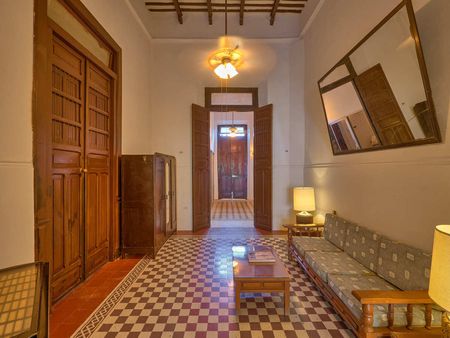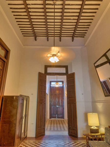 Currently distributed across various sections, the home includes a mix of finished and unfinished spaces. In its present state, there are 3 bathrooms and enough existing structure to accommodate up to 7 bedrooms. The central area features soaring ceilings, pasta tiles, and wooden doors, while the rear additions open directly onto the gardens and terrace.