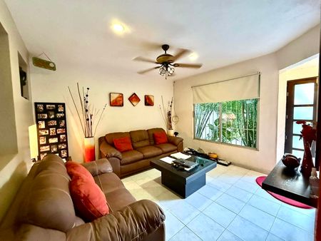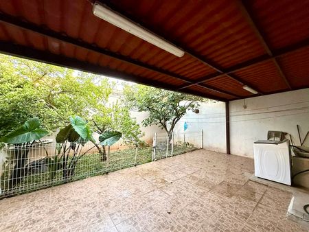 La casa cuenta con un patio grande con tinglado, perfecto para crear una piscina, terraza o área de convivencia. Además, tiene árboles frutales, asador de piedra y cochera para varios autos.