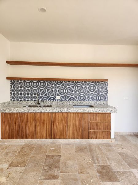 - Carpintería en cocina integral debajo de meseta a base de 4 puertas de listón parota y 1 columna de cajones de listón de parota, en la parte superior 2 repisas como se muestra en el render con laminado de parota