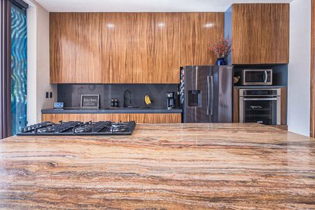 Cocina equipada con isla y mucho espacio de almacenamiento