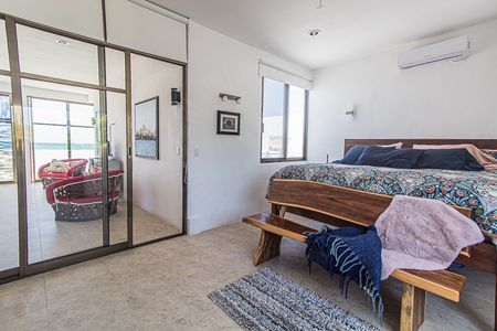 Casa Kukulkan features a spacious kitchen, outfitted with ample storage and a breakfast bar, ideal for casual morning gatherings. The kitchen’s open layout flows into the living space, creating an environment perfect for entertaining or simply enjoying the tranquility of your seaside haven.