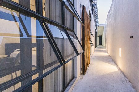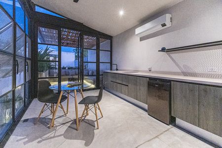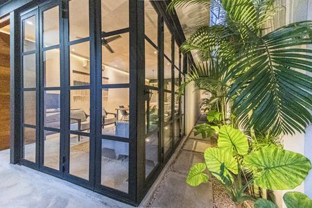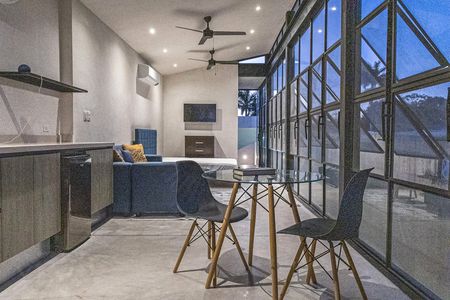 Iron glass doors and windows provide breezes and tons of natural light, the casita integrates two apartments with an elegant open layout design. The downstairs unit features a spacious bedroom that faces the central patio, Tzalam wood deck, and the swimming pool complete with full bathroom, fully equipped kitchen, living and dining areas. Upstairs is a 1 bedroom, 1 full bathroom complete with a private terrace, kitchenette, living and dining area.