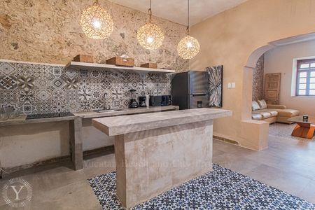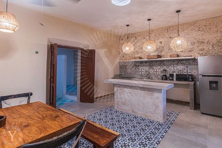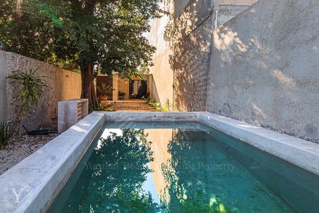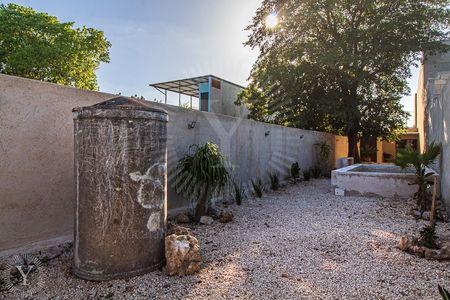 Acabados de chukum, paredes de mampostería y pisos de pasta abrazan la mezcla de Mérida moderna y colonial. La casa tiene sala, comedor, cocina, una recámara con vestidor, baño completo, terraza techada, cochera, piscina y amplio terreno.