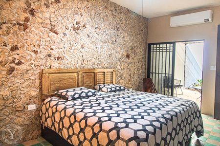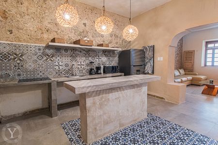 Chukum finishes, mampostería walls and pasta tile floors embrace the blend of modern and colonial Merida. Features include living room, eat-in kitchen, one bedroom with walk-in closet, full bath, covered terrace, carport, swimming pool and spacious lot.