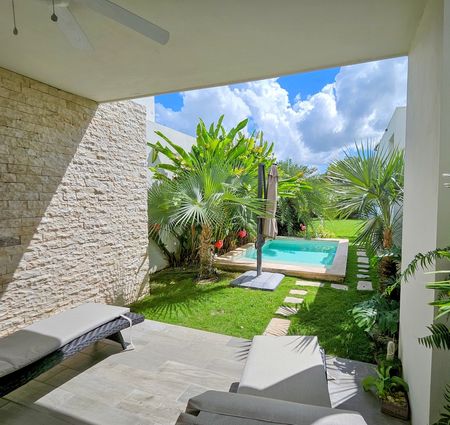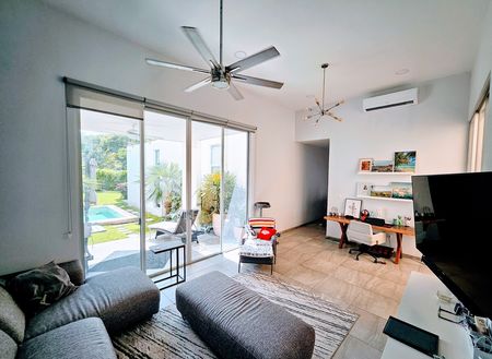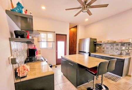 Nestled within a secure gated community in Conkal, this impeccably appointed home is part of an intimate enclave of just 30 residences, ensuring a heightened sense of exclusivity and safety with 24-hour security. This charming, three-year-old property offers a prime location within walking distance to an array of amenities, including authentic taquerias, enticing restaurants, well-equipped hardware stores, convenient stores and local tiendas. The home features covered off-street parking for two vehicles, soaring fourteen-foot ceilings in the living room, and ten-foot ceilings throughout the rest of the home, while also enjoying close proximity to a picturesque running trail and a delightful bike path, making it perfect for active individuals or families looking to embrace an outdoor lifestyle.