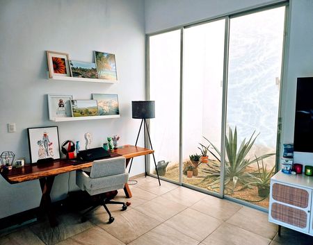 The bright and airy kitchen showcases a spacious island with a built-in breakfast bar, ample storage in the pantry, and custom-designed cabinets. It is fully equipped with a 6-burner Whirlpool range and a Whirlpool Double Door Refrigerator, all accentuated by an elegant pasta tile backsplash. The residence consists of 2 well-appointed bedrooms, 3 modern bathrooms, and a conveniently located laundry room. The primary bedroom impresses with its en-suite bathroom and an expansive walk-in closet, while the secondary bedroom offers versatility to accommodate both a comfortable bed and a fully functional office space, complete with a built-in closet. Furthermore, the property features a spacious living room that opens to a terrace overlooking a pristine pool area, as well as generously proportioned bathrooms. Additionally, the home boasts the presence of 2 atriums adorned with beautiful gardens, adding a touch of natural serenity to the property.
