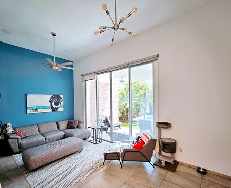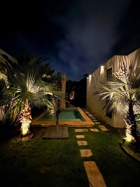 You can unwind in the inviting pool or relax on the comfortable covered terrace within a tranquil outdoor space set in a private backyard. The surroundings are adorned with colorful gardens and verdant grass, offering plenty of space for your pets and children to frolic. Additionally, the area is equipped with eco-friendly features, including 6 solar panels with battery backup, pressurized water, double insulated ceiling and a biodigester for efficient waste management.