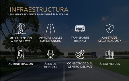 Además, la infraestructura incluye electricidad de media tensión a pie de lote y ductería de voz y datos, asegurando que todas las necesidades tecnológicas de su empresa estén cubiertas.