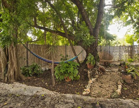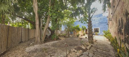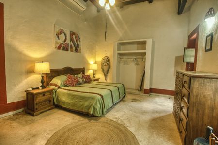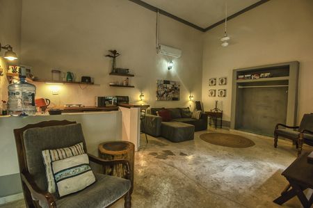 ¡Imagínese relajándose en este entorno tropical! Completamente cercado para mayor privacidad. Ingrese a través de su jardín privado adyacente a un espacio de estacionamiento. Su dormitorio es espacioso y cuenta con una cama King muy cómoda con ropa de cama y sábanas incluidas. Está separado de su sala de estar y cocina estilo galera. ¡Ambas habitaciones tienen techos de 18 pies de alto construidos con vigas de madera que datan de antes de 1900! Este apartamento estudio completo es parte de la "Casa de Las Máquinas" ubicada en una parte de la histórica Hacienda San Pedro Noh Pat.