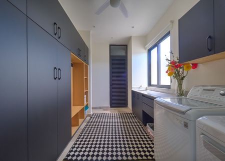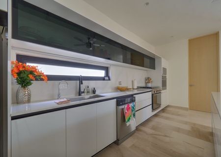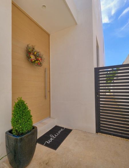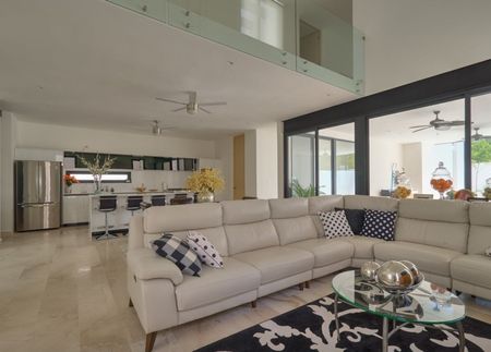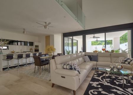 Vendedor pide $10,000,000 pesos por esta moderna casa estilo loft. El plano de planta versátil cuenta con el dormitorio principal en el nivel de entrada. Subiendo una escalera de granito estilo columna vertebral encontrará 2 dos dormitorios con baño y una gran sala de usos múltiples. Esta casa personalizada tiene pisos de mármol texturizado en todas partes. Los baños tienen paredes de azulejos geométricos. Este concepto de loft permite que toda la casa esté bañada por luz natural. Observe las puertas del lavadero hechas de un material que no deja huellas dactilares. La cocina integral tiene iluminación debajo de los gabinetes y encimeras de silestone, además de acceso directo al patio exterior cubierto con pisos de piedra travertino con vista a la piscina. El paisajismo a lo largo de las paredes interiores del jardín está de moda y pronto se convertirá en un exuberante jardín tropical. Lote contiguo a este está disponible por $1,900,000 pesos.