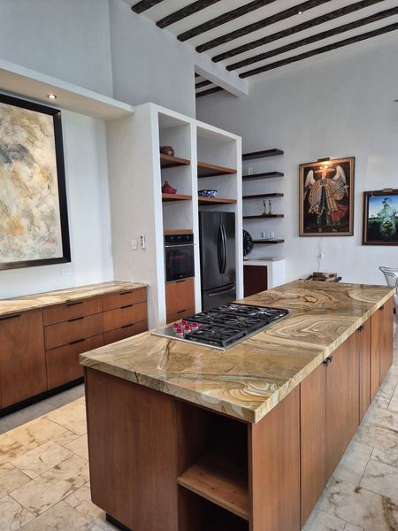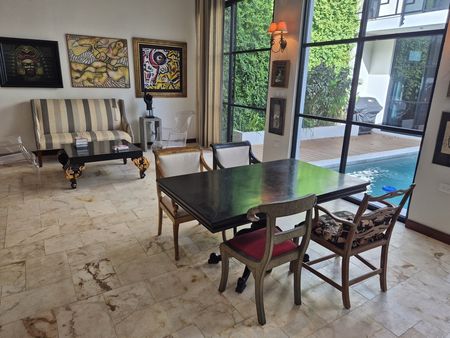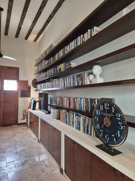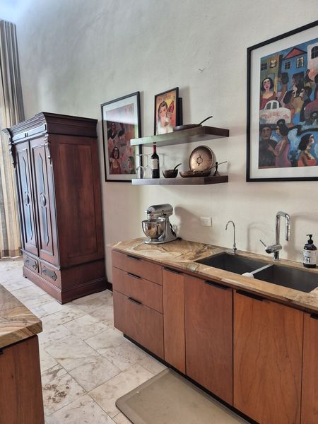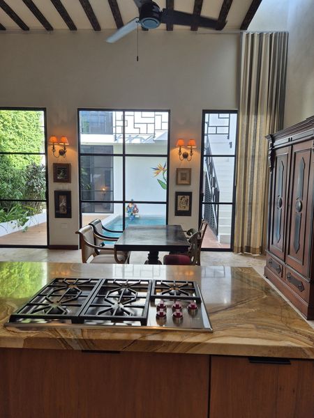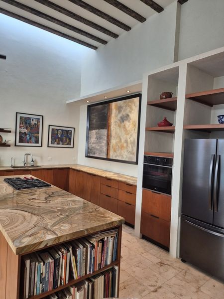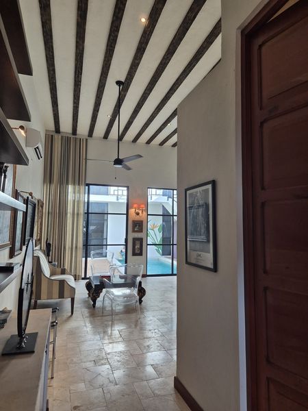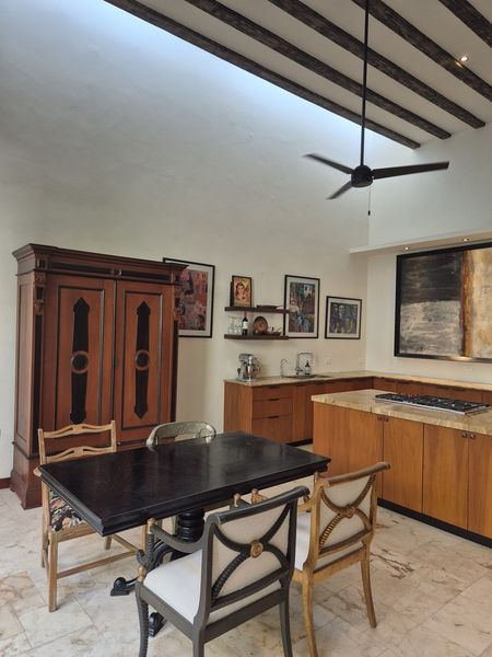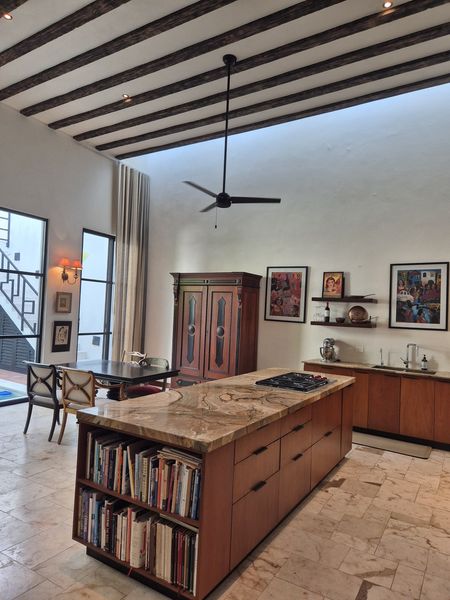 Téngalo TODO en esta casa para siempre del constructor ubicada cerca del barrio Centro de Mérida, conocido como San Sebastián. Este "barrio" cuenta con una hermosa iglesia en su parque principal y muchos festivales durante cada año. Con ocho metros de ancho, este lote ofrece mucho espacio para un garaje cerrado de gran tamaño con almacenamiento, además de tragaluz y una atractiva entrada peatonal. TODOS los pisos de esta casa son de baldosas locales de crema maya. Una vez dentro del vestíbulo de entrada, no puede evitar notar los techos altos y la artesanía de calidad de las puertas de cedro en todas partes. Las superficies planas son de granito en losa, al igual que los salpicaderos de la cocina. La cocina gourmet tiene una isla con barra de desayuno. El agua caliente instantánea da servicio a la cocina y su lavavajillas. ¡El horno a gas de la marca "WOLF" del chef y la estufa de 6 quemadores no dejan nada que desear! El comedor se abre al espacio del jardín trasero entre la casa principal y los dormitorios separados más allá. Dos suites de dormitorio muy espaciosas son idénticas, una ubicada en el nivel principal y la otra se accede por una escalera exterior hecha de baldosas de piedra consuela. Ambos tienen hermosas vistas a la piscina filtrada y CLIMATIZADA y a los jardines tropicales que la rodean. Los pisos exteriores de bajo mantenimiento “TREX” brindan una superficie antideslizante.