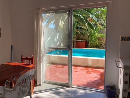 La casa cuenta con una gran sala de estar, una sala de música, un dormitorio, un baño grande con área para la lavandería y una cocina comedor. Toda la casa tiene mucho espacio de almacenamiento, mientras que la cocina tiene mucho espacio de trabajo en el mostrador. La gran puerta corrediza de vidrio da una vista de la piscina filtrada con patio y jardín. Uno puede encontrar plátanos, cocos, papayas y otras plantas tropicales exóticas. Hay un camino que discurre entre el jardín delantero y la zona de la piscina.