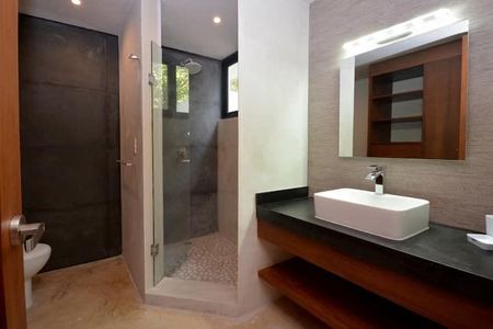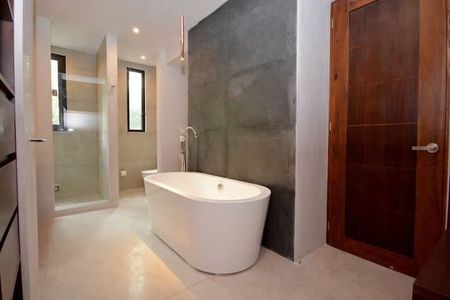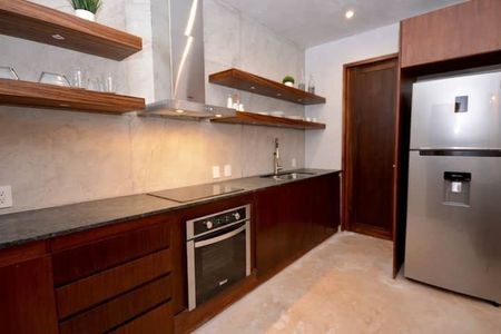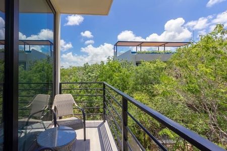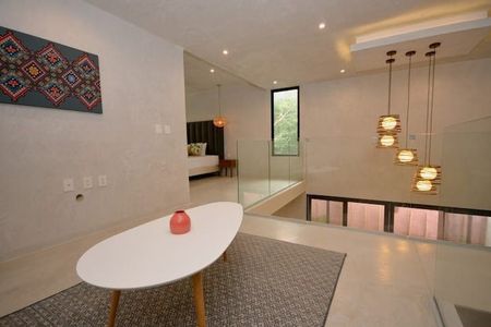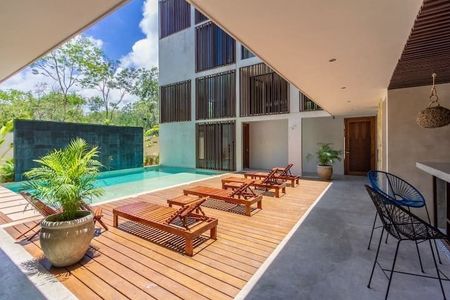 Lofts de lujo a estrenar en Aldea Zama Tulum. Disfrute de la entrada segura e impresionante al área común. Recepción. Techos altos dobles en el lobby amueblados con muebles de madera natural de la zona. La piscina y su área de entretenimiento se complementan con un bar que te espera para organizar tu próxima fiesta en la piscina. También hay una pequeña cocina y baños de piscina para uso de los propietarios. Los lofts cuentan con modernas cocinas integrales con electrodomésticos. Las encimeras de piedra oscura y el protector contra salpicaduras se suman al estilo industrial en todo este proyecto. Una escalera de metal conduce a su dormitorio tipo loft y su impresionante baño con una bañera independiente. Las baldosas cerámicas con estampado de madera oscura están en el interior y se encuentran en los patios de los niveles inferiores y las terrazas de los niveles superiores. La ducha al aire libre con cadena más una piscina privada con filtro son adiciones a este loft premium. Cerca de restaurantes y tiendas.